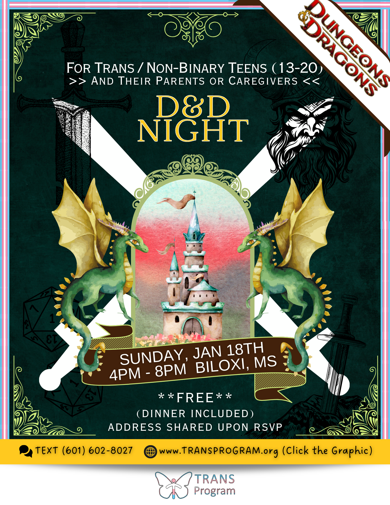Supper Saturday is a SUPPORT event for the TRANSGENDER and GENDER NON-CONFORMING community, as well as their PARENTS/CAREGIVERS (or trans-affirming guest) on the LAST SATURDAY of EVERY month. Come enjoy FREE food, activities and community support! You may just gain something you didn’t know you needed! Community Agreements Enforced