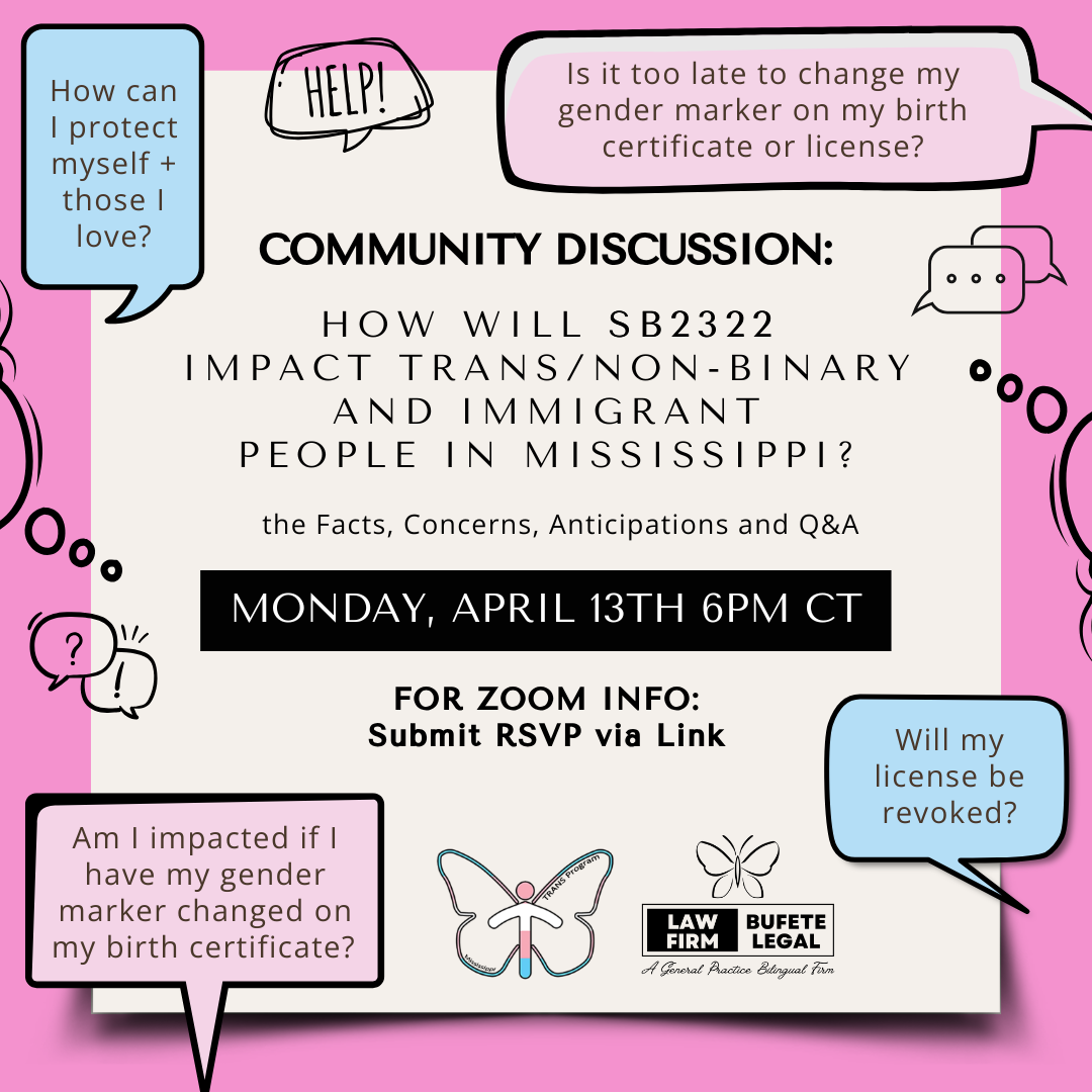 Several anti-trans bills have passed and, therefore, become law in Mississippi. This DOES NOT mean that we should not continue to reach out to and educate our legislators (and others). Keep pushing back! Stand up, speak up, help PUSH BACK on anti-trans laws / policy, help PUSH FORWARD laws / policy that serve to IMPROVE TRANS LIVES. Detailed and easy to understand educational materials, pertaining to said laws, are soon to be published. Please keep up with us!