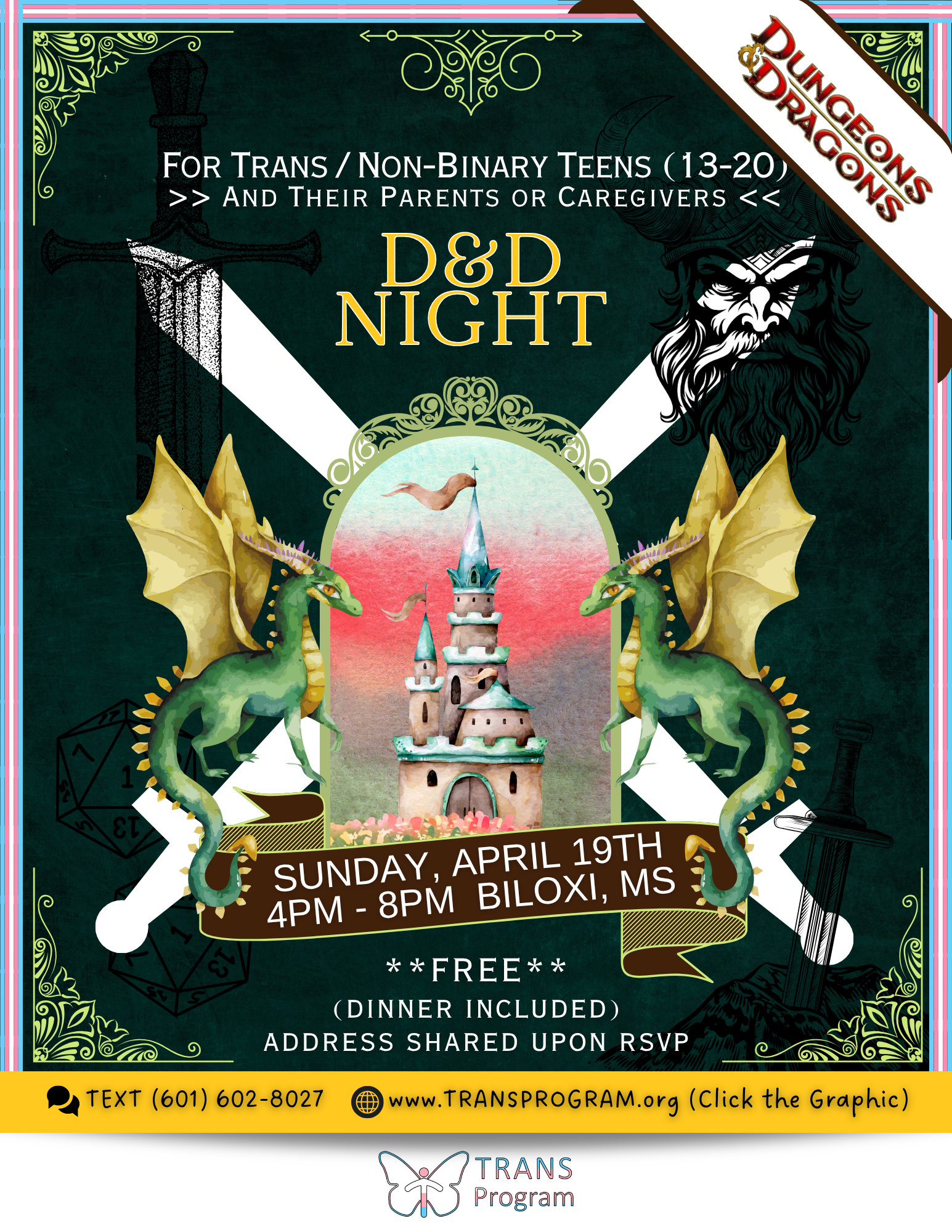 Supper Saturday is a SUPPORT event for the TRANSGENDER and GENDER NON-CONFORMING community, as well as their PARENTS/CAREGIVERS (or trans-affirming guest) on the LAST SATURDAY of EVERY month. Come enjoy FREE food, activities and community support! You may just gain something you didn’t know you needed! Community Agreements Enforced